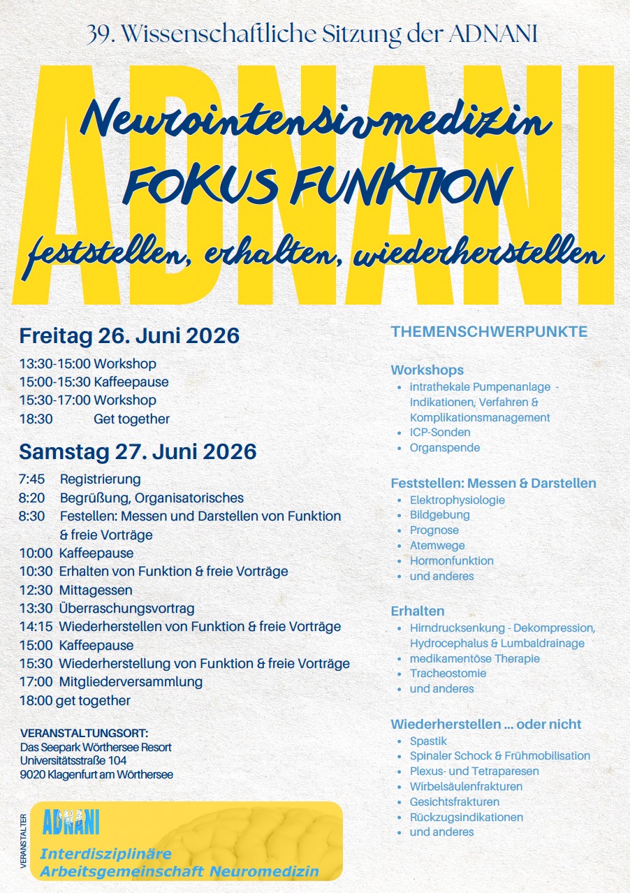 wir freuen uns sehr, Sie zur 39. wissenschaftlichen Sitzung der ADNANI einzuladen, die am 26. und 27. Juni 2026 in Klagenfurt stattfinden wird.